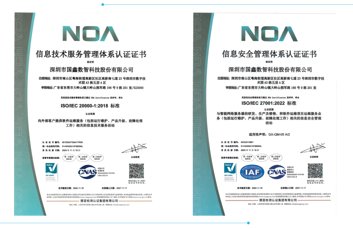 基于此次双证的取得,从侧面论证了Gooxi能够快速高效为外部客户包括政府部门,提供高标准、高性能、高安全的信息技术服务,同时顺利获得健全的数据保护机制能够有效确保客户资料安全。除此之外,还具备超强抗风险能力,杜绝安全隐患。